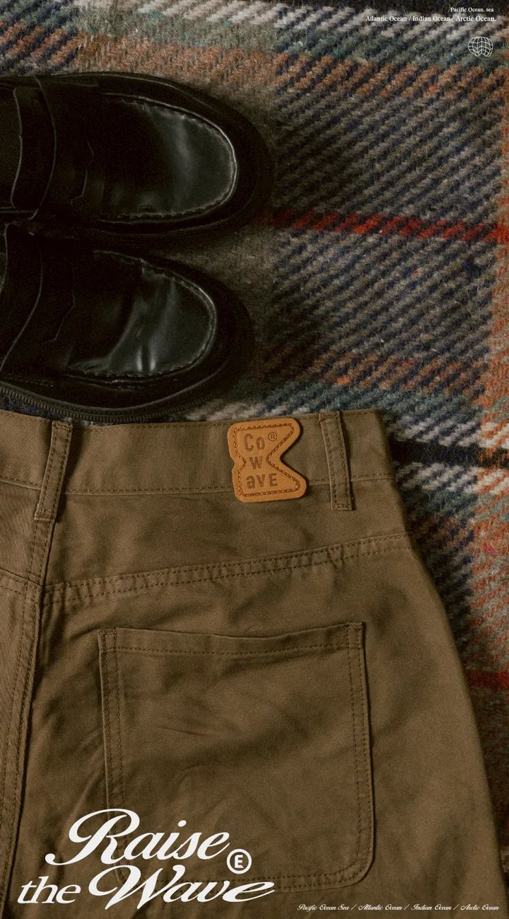 細節處,左側褲管刺繡 COWAVE 手寫塗鴉字樣,低調點綴但不失質感。